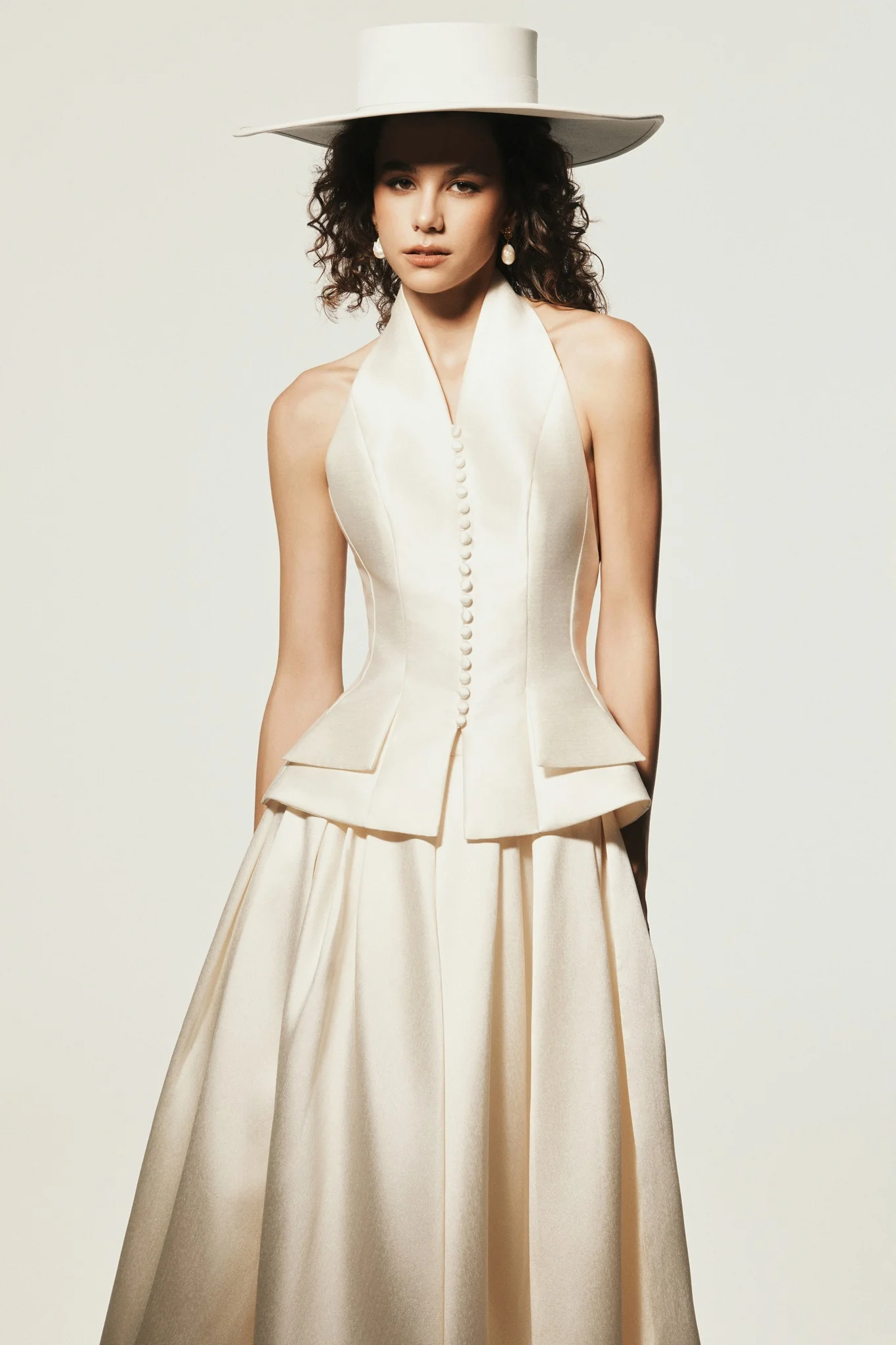 Material: 100% Polyester Color: Cream white Design: A tailored vest with a deep back cut, high neckline, and a fitted bodice that flares gently at the hips. Detailed with a single row of buttons along the front. Crafted from taffeta with a subtle sheen and structured finish. Size S Measurements (cm): Length: 57 Bust: 86 Waist: 66 Hips: 104 Size M Measurements (cm): Length: 59 Bust: 90 Waist: 70 Hips: 108 Size L Measurements (cm): Length: 61 Bust: 94 Waist: 74 Hips: 112 Note: A tolerance of ±1 cm is allowed in production. Bust: No pads/wire Stretch: Low Washing instructions: Dry Clean & Hand-wash |